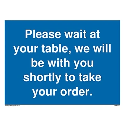 No Symbol This sign is made from vinyl / sticker ‘Air Release†vinyl makes it easy to stick to flat, clean surfaces without bubbles. Not for rough, plastic or dusty surfaces. A5 landscape Sign Text: Please wait at your table, we will be with you shortly to take your order.