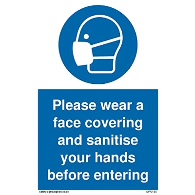 No Symbol This sign is made from vinyl / sticker ‘Air Release†vinyl makes it easy to stick to flat, clean surfaces without bubbles. Not for rough, plastic or dusty surfaces. A6 portrait Sign Text: Please wear a face covering and sanitise your hands before entering
