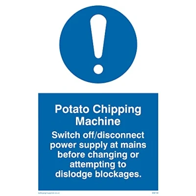 No Symbol This sign is made from vinyl / sticker ‘Air Release†vinyl makes it easy to stick to flat, clean surfaces without bubbles. Not for rough, plastic or dusty surfaces. A6 portrait Sign Text: Potato Chipping Machine Rules