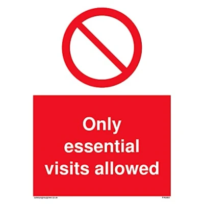 No Symbol This sign is made from vinyl / sticker ‘Air Release†vinyl makes it easy to stick to flat, clean surfaces without bubbles. Not for rough, plastic or dusty surfaces. A5 portrait Sign Text: Prohibition symbol Only essential visits allowed