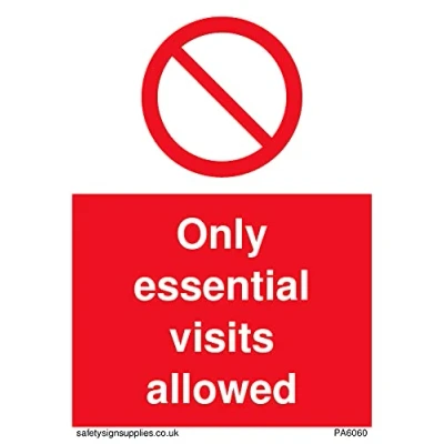 No Symbol This sign is made from vinyl / sticker ‘Air Release†vinyl makes it easy to stick to flat, clean surfaces without bubbles. Not for rough, plastic or dusty surfaces. A7 portrait Sign Text: Prohibition symbol Only essential visits allowed
