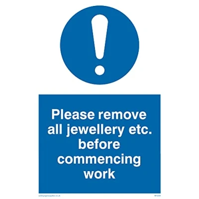 No Symbol This sign is made from vinyl / sticker ‘Air Release†vinyl makes it easy to stick to flat, clean surfaces without bubbles. Not for rough, plastic or dusty surfaces. A6 portrait Sign Text: Remove All Jewellery For Work