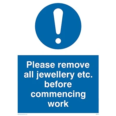 No Symbol This sign is made from vinyl / sticker ‘Air Release†vinyl makes it easy to stick to flat, clean surfaces without bubbles. Not for rough, plastic or dusty surfaces. A5 portrait Sign Text: Remove All Jewellery For Work