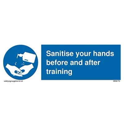 No Symbol This sign is made from vinyl / sticker ‘Air Release†vinyl makes it easy to stick to flat, clean surfaces without bubbles. Not for rough, plastic or dusty surfaces. 15 landscape Sign Text: Sanitise your hands before and after training