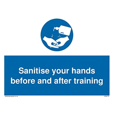 No Symbol This sign is made from vinyl / sticker ‘Air Release†vinyl makes it easy to stick to flat, clean surfaces without bubbles. Not for rough, plastic or dusty surfaces. A5 landscape Sign Text: Sanitise your hands before and after training