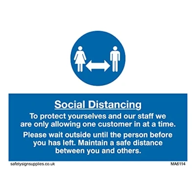 No Symbol This sign is made from vinyl / sticker ‘Air Release†vinyl makes it easy to stick to flat, clean surfaces without bubbles. Not for rough, plastic or dusty surfaces. A7 landscape Sign Text: Social distancing to protect you and our staff