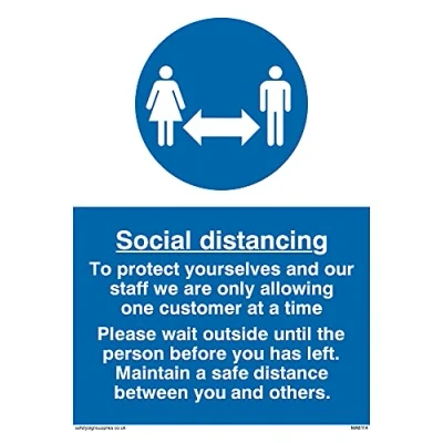 M916 : Keep distance This sign is made from vinyl high tack A stickier sticker. Uses a stronger adhesive to make it more suitable for plastic surfaces like Wheelie Bins or where the sticker might get rubbed. A5 portrait Sign Text: Social distancing to protect you and our staff