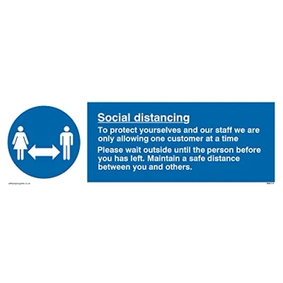 No Symbol This sign is made from vinyl / sticker ‘Air Release†vinyl makes it easy to stick to flat, clean surfaces without bubbles. Not for rough, plastic or dusty surfaces. 31 landscape Sign Text: Social distancing to protect you and our staff
