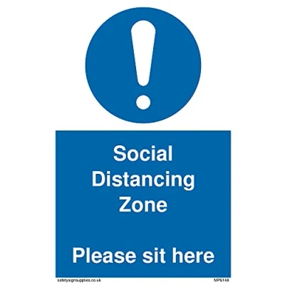 No Symbol This sign is made from vinyl / sticker ‘Air Release†vinyl makes it easy to stick to flat, clean surfaces without bubbles. Not for rough, plastic or dusty surfaces. A6 portrait Sign Text: Social Distancing Zone Please sit here