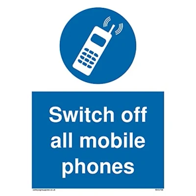 M905 : Use a mobile phone This sign is made from vinyl high tack A stickier sticker. Uses a stronger adhesive to make it more suitable for plastic surfaces like Wheelie Bins or where the sticker might get rubbed. A5 portrait Sign Text: Switch off all mobile phones with symbol