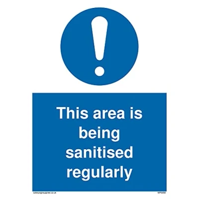 M001 : General mandatory action This sign is made from vinyl high tack A stickier sticker. Uses a stronger adhesive to make it more suitable for plastic surfaces like Wheelie Bins or where the sticker might get rubbed. A5 portrait Sign Text: This area is being sanitised regularly