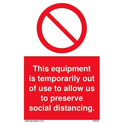 No Symbol This sign is made from vinyl / sticker ‘Air Release†vinyl makes it easy to stick to flat, clean surfaces without bubbles. Not for rough, plastic or dusty surfaces. A6 portrait Sign Text: This equipment is temporarily out of use to allow us to preserve social distancing.