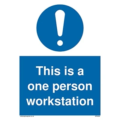 M001 : General mandatory action This sign is made from vinyl high tack A stickier sticker. Uses a stronger adhesive to make it more suitable for plastic surfaces like Wheelie Bins or where the sticker might get rubbed. A5 portrait Sign Text: This is a one person workstation with mandatory symbol