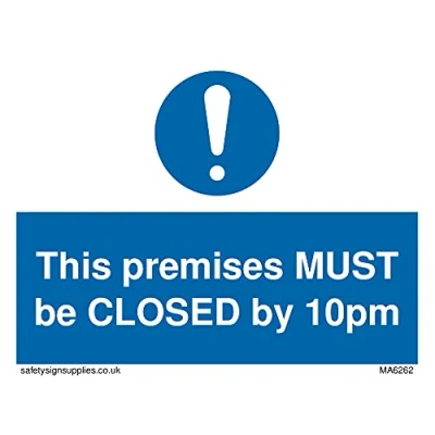No Symbol This sign is made from vinyl / sticker ‘Air Release†vinyl makes it easy to stick to flat, clean surfaces without bubbles. Not for rough, plastic or dusty surfaces. A7 landscape Sign Text: This premises MUST be CLOSED by 10pm