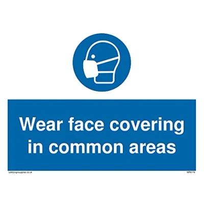 M016 : Wear a mask This sign is made from vinyl high tack A stickier sticker. Uses a stronger adhesive to make it more suitable for plastic surfaces like Wheelie Bins or where the sticker might get rubbed. A5 landscape Sign Text: Wear face covering in common areas