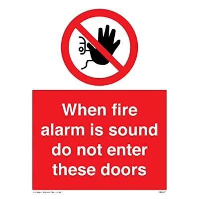 P905 : No access This sign is made from vinyl high tack A stickier sticker. Uses a stronger adhesive to make it more suitable for plastic surfaces like Wheelie Bins or where the sticker might get rubbed. A5 portrait Sign Text: When Fire Alarm Is Sound Do Not Enter These Doors
