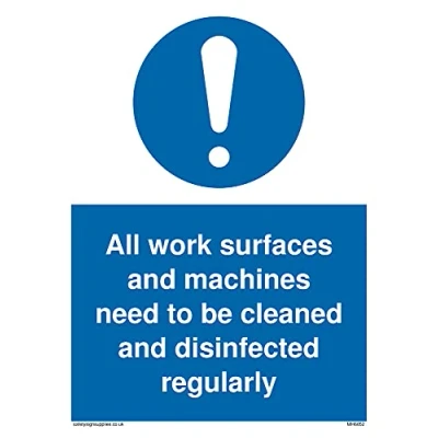M001 : General mandatory action This sign is made from vinyl high tack A stickier sticker. Uses a stronger adhesive to make it more suitable for plastic surfaces like Wheelie Bins or where the sticker might get rubbed. A5 portrait Sign Text: Work surfaces and machine need to be disinfected regularly