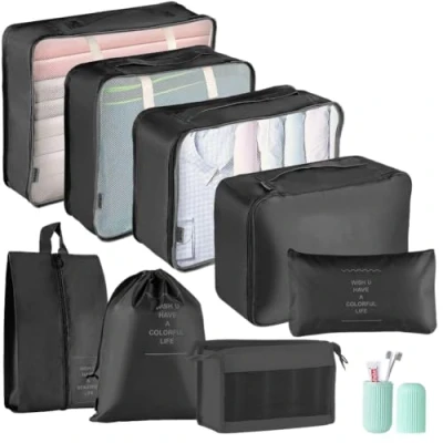 9 Pcs Super Value Travel Packing Set: The set include 3 packing cubes with see through mesh top for clothes, 1 private cubes for bras and underwear, 1 travel shoes bag, 1 toiletry bag, 1 toothbrush cup,1 laundry bag for dirty clothes and 1 flat bag for small items, like socks, electronic accessories or keys. Buckle Design: Clothes Bag Set can store and classify clothing, dirty linen, underwear, shoes, cosmetics, toiletries and electronics accessories well. Keeping your things tidy reduces clothing wrinkles and other travel damage. Top Visible Mesh Design: With mesh material on the top of the travel luggage organizers, transparent & breathable, allows you to quickly access and find the item what you need. Brand new buckle design can storage clothes and not scatter them. Save time and space in your suitcase. High Quality and Durable: Suitcase Organizer is made of high quality nylon fabric, with exquisite workmanship, waterproof fabric and very durable. Double premium metal zipper design allows your right and left hand to open. Wide Application: The organiser bags set has a grab handle easy to carry. Super light and foldable,you can fold and put them to your bag, backpack to carry, ideal for business trips, family holidays, skiing, camping.