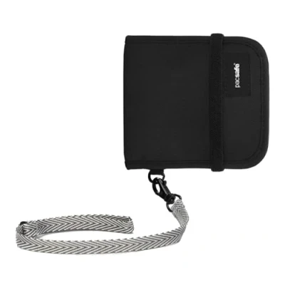 RFID blocking compact wallet with Dyneema webbing strap; ideal compact travel wallet that blocks the transmission of sensitive information and gives peace of mind when traveling Hard-to-cut Dyneema webbing strap can be worn around the wrist or secured to a belt loop to help prevent pickpockets Internal organization includes a zippered note slot, slip note slot and slip pocket, as well as five card slots. 5x0.4x4.8