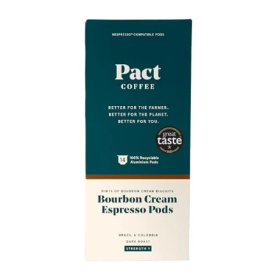 Pact Coffee Bourbon Cream Espresso Pods 14 x 5.4g with Hints of Bourbon Cream Biscuits Great Taste Award 2023 Brazil & Colombia Dark Roast - Strength 9 Direct Trade - Certified B Corporation - Using Business as a Force for Good Nespresso Compatible Pods