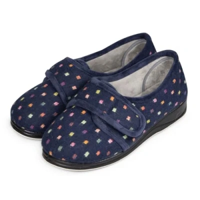 𝐈𝐍𝐍𝐄𝐑 𝐀𝐍𝐃 𝐎𝐔𝐓𝐄𝐑 𝐌𝐀𝐓𝐄𝐑𝐈𝐀𝐋: The inner and outer materials of the Lotty womens slipper is high-quality textile that can easily be cleaned and maintained. These slippers are designed with a memory foam footbed and rubber/textile outsole. 𝐒𝐔𝐏𝐄𝐑 𝐒𝐎𝐅𝐓 𝐅𝐎𝐀𝐌 𝐅𝐎𝐎𝐓𝐁𝐄𝐃: The cosy memory foam insoles of these slippers are super soft and comfortable. 𝐂𝐎𝐌𝐅𝐎𝐑𝐓𝐀𝐁𝐋𝐄 𝐃𝐔𝐀𝐋-𝐅𝐈𝐓: These 4E/6E dual-fit slippers mean that you can remove the footbed to increase the width or add your own orthotics. They will snuggle your feet in warmth while providing a perfect, comfortable fit. 𝐃𝐔𝐑𝐀𝐁𝐋𝐄 𝐑𝐔𝐁𝐁𝐄𝐑 𝐒𝐎𝐋𝐄: The rubber sole is hard-wearing and means it is suitable for indoor wear as well as popping out to the bins or to chat to a neighbour. With great traction, you can walk confidently in comfort. 𝐒𝐓𝐘𝐋𝐈𝐒𝐇 𝐏𝐎𝐋𝐊𝐀 𝐃𝐎𝐓 𝐃𝐄𝐒𝐈𝐆𝐍: These stylish ladies slippers are designed with stunning polka dot textile that gives you ultimate comfort but also makes you feel stylish around the home.