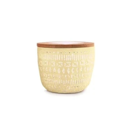 FRESH MEYER LEMON: Smells like a clean kitchen on a summer day in the very best way; it's all the best parts of having a clean kitchen, but all you have to do is light the candle DESERT VIBES ABOUND: Inspired by the American West, this range features rough concrete vessels etched and painted by hand, each topped with a bamboo lid; available in two sizes CLEAN BURN: This 85 gram yellow coloured pot is filled with our Fresh Meyer Lemon scent; soy-blend wax and cotton wick helps your candle burn beautifully; trim wick before a new burn for a contained flame and even burn UPCYCLED BEAUTY: Vessel is designed with upcycling in mind - after burning the candle, freeze jars overnight to cleanly remove the wax and wick; great for storing beauty items, holding knick knacks, or as a planter ARTFULLY CRAFTED: Paddywax is an artisan company specializing in candles and diffusers that that are made with quality materials, inspiring colour palettes, and intriguing fragrances to set the tone in your home
