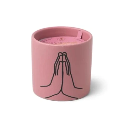 SWEET VIOLET VANILLA FRAGRANCE: Notes of bergamot, Parma violet, and French vanilla lend to this candle's sweet aroma; we work with perfumers to source nature's finest ingredients, creating high-quality candles that tell a special fragrance story to fit your mood APPROXIMATELY 37 HOURS OF CLEAN BURN TIME: This 163 gram black matte ceramic vessel is filled with our soy wax blend free of formaldehyde, phthalates, and animal-sourced ingredients, making them safe, as well as cruelty-free DARK PINK CERAMIC: With praying hands painted hand drawn design; comes with a gold foil stamped dust cover that reads, "Thankful For You," to share with the people you love - it's like the grown-up version of friendship bracelets UPCYCLE THE CONTAINER: Vessel is designed with upcycling in mind - after burning the candle, freeze jars overnight to cleanly remove the wax and wick; great for storing beauty items, holding knick knacks, or as a planter MADE BY PADDYWAX: A Nashville-based company known for creating thoughtfully designed candles; each Paddywax candle is made and sourced intentionally and features a mix of materials, shapes, and unique fragrances to set the scene for beautiful memories made by candlelight