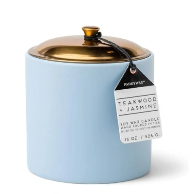 SCANDI-INSPIRED HYGGE RANGE Features matte ceramic vessels with copper lids and Paddywax's proprietary soy wax blend KEEP COZY: "Hygge" (pronounced 'hooga') is the Danish word for coziness; capture a feeling of warmth when you're hosting an intimate dinner party or enjoying a night on the couch CLEAN BURN: This circular 425 gram container is filled with our signature soy-blend wax and Teakwood + Jasmine scent; cotton wick helps your candle burn beautifully- carefully trim the wick before a new burn for a contained flame and even burn UPCYCLED BEAUTY: Our scented soy candle is designed with upcycling in mind—after you burn your candle, freeze the jar overnight to remove the wax and wick and create a charming storage container ARTFULLY CRAFTED: Paddywax is an artisan company specializing in candles and diffusers made with quality materials, inspiring colour palettes, and alluring scents to set your home’s tone
