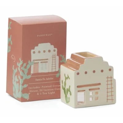 HOUSE CONE HOLDER GIFT SET Includes a southwestern-style adobe house incense holder crafted of durable ceramic, 20 incense cones, and a tealight; place on a table or shelf to create an evocative experience for the senses MINI HOUSE measures approximately 7.62cm long x 5.08cm wide x 3.15-inches tall; incense cones have a 6 - 7 minute burn time PALO ALTO A luxurious scent with notes of bergamot, black leather, and dark oak; Paddywax fragrance blends are crafted with alluring fragrance oils and are designed to be both complex and balanced COLLECT THEM ALL Adorable little houses featuring iconic architecture from across the globe; hand painted details make each holder unique; collect them all to create your own little village MADE BY PADDYWAX, A Nashville-based company known for creating thoughtfully designed candles; each Paddywax candle is made and sourced intentionally and features a mix of materials, shapes, and unique fragrances to set the scene for beautiful memories made by candlelight