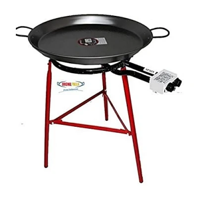 AmazonHigh quality 70cm polished steel paella pan Holds 30 tapa portions or 24 main servings. 400mm Gas Burner Ring for Paella Pan (Paellera) 65 cm long reinforced legs and 48 cm slotted spoon included. Very easy to use, excellent results for your barbecue or garden party.