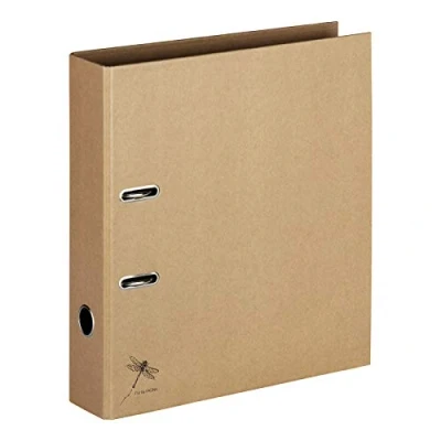 Folder for formats up to DIN A4 with cover made of sturdy grey cardboard (RC) covered with kraft paper. 75 mm spine width for large filling capacity and high stability Kraft paper made from 100% fresh fibre is biodegradable, reusable and recyclable. High-quality, subtle print of a dragonfly in deliberately natural design The cover can be individually designed with different pens With practical lever mechanism and hold-down holder for safe storage of perforated documents Dimensions: 290 x 320 x 75 mm, 75 mm spine width – box contents: 1 piece 50390-11, natural