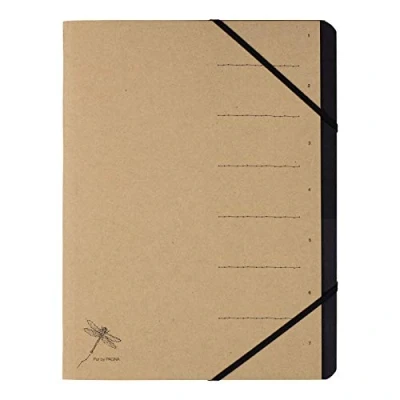 Folder for A4 documents, 7 compartments, recycled cardboard, with black elastic corner, 2 holes in the book pad, black index made of sturdy cardboard for quick access to stored documents Print 1-7 and a dragonfly in deliberately natural design on the lid The cover can be customised with different pens Thanks to the practical elastic closure, all documents hold securely in place Dimensions: 240 x 320 x 4 mm. Box contents: 1 piece 40060-11, natural