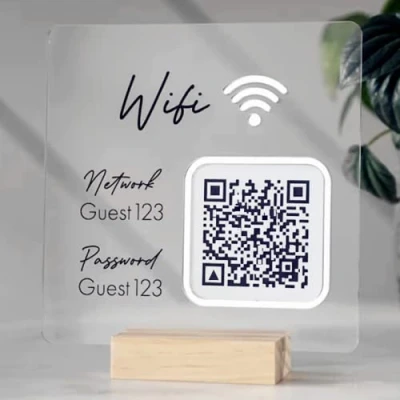 Personalised : Please click top right 'CUSTOMISE NOW' to add your details Convenient: Do you ever get tired of people visiting and asking for your Wi-Fi network and password? Solve that with our custom Wi-Fi QR Code and NFC Sign UV Print: This sign is directly UV printed on the acrylic sheet, would easily come off Usage scenarios: bookstore, clothes store, shoe store, souvenir, jewelry store, cosmetics store, snack bar, realty office room, hairdresser, Salon,Business Logo Hard wearing: Do not cause scratches, Cast acrylic is one of the hardest thermoplastic sheet materials available and its attractive aesthetics remain for longer than other plastic sheet materials. Notice: Customers need to generate their own qr code