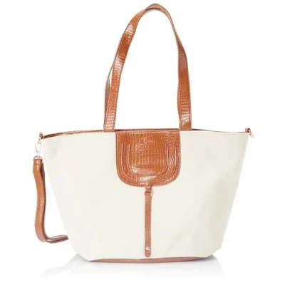 Feminine shopper Made of light canvas fabric Faux leather patches with crocodile embossing Large lined interior Side inner pocket