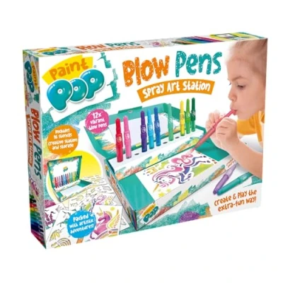 CREATE AND PLAY THE EXTRA FUN WAY – It’s time for big artistic adventures with this Blow Pens Spray Art Activity Station Set from Paint Pop! This fun and innovative set allows kids to create vibrant, airbrush-style artwork. FUN CREATIVE ACTIVITY KIT - The kit includes 12 blow pens, 14 A5 stencils, 2 A4 stencils, 14 A5 blank sheets, 2 A4 sheets, and a pen tray for easy organisation. Ideal for fostering creativity and fine motor skills, this kit provides endless opportunities for colourful art projects and hands-on fun. FEATURES QUICK ASSEMBLY PENS – Featuring 12 Paint Pop’s Blow Pens, each containing vibrantly coloured non-toxic, quick-drying paint, all quick and easy to assemble. The pens contain a top, cartridge and mouthpiece. EASY TO USE – To use the Blow Pens, simply pull apart the pen top and mouthpiece and remove the cartridge from the mouthpiece. Then insert the tip into the end of the pen top and re-fit the mouthpiece to the top. Now, position the pen tip near the paper and blow through the mouthpiece. After use, to prevent it from drying out, always remove the cartridge from the pen top, insert it back into the mouthpiece and replace the top. GET CREATIVE - Protect your work area with newspaper and place a stencil on the paper supplied. Choose a pen, and hold it about 8-10 cm from the paper and blow into the end. You can layer colours and blow harder or softer to create shading and blending effects, then remove the stencil to reveal your creation and allow it to dry. You can use the marker pen at the end of the paint pen as a standard marker to add extra detail or wording to your art piece., Manufacturer: Paint Pop