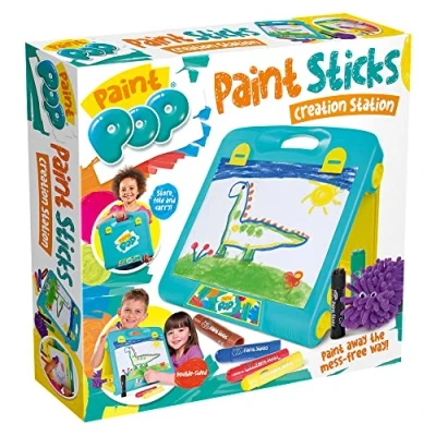DOUBLE SIDED WITH STORAGE - Creation Station is a wonderful table-top easel with everything needed for young artists to create their own masterpieces. It's double-sided, so creative times can be enjoyed with friends. One side has handy clips to hold paper, while paint can be applied directly to the whiteboard on the other. STORE, FOLD & CARRY - Quick & easy to set up. When you have finished, simply store away the accessories, fold up the Creation Station and take convenient painting fun with you, wherever you go. DISPLAY WORKS OF ART - Our paint is quick drying, often in under 60 seconds. The easel makes a great display item to show off the finished paintings. INCLUDES 6 PAINT STICKS - Six chunky paint sticks and included and the smooth glide-on paint works without needing water or brushes. Twist the stick and you’re ready to paint away with no mess, creating a happy experience for all. OTHER ACCESSORIES - The Creation Station comes complete with 6 classic colour Paint Pop Paint Sticks, a character duster which you dampen to wipe clean the whiteboard surface &, 10 sheets of A4 white paper to get you started., Manufacturer: Paint Pop