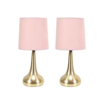 Pair Brushed Gold Teardrop Touch Dimmer Table Lamps with Blush Pink Shade Bedside Light LED Bulbs Included