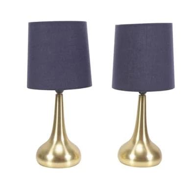 Pair Brushed Gold Teardrop Touch Dimmer Table Lamps with Navy Blue Shade Bedside Light LED Bulbs Included