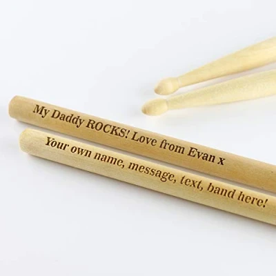 Size: 5A (16 Inch) - Made from: Maple High Quality Wood The drumsticks are size 5A and made of maple wood, we laser engrave your choice of text, the same on both sticks. Made from: Maple High Quality Wood Our maple drumsticks can be personalised with a message, a name or a favourite band. Our maple drumsticks can be personalised with a message, a name or a favourite band. The perfect gift for a music lover!