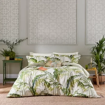 The Palm House bedding collection makes an oasis of even the most modest interior with an elegant arrangement of palm leaves. This duvet cover features a small scale geometric print on the reverse and finished with narrow piping. Sorry patterned pillowcases no longer available.