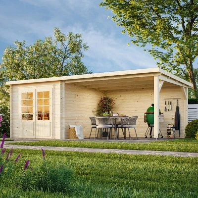 ShedstoreThe Ella 6x3m Palmako Log Cabin combines indoor and outdoor sheltered space to create an attractive multi-purpose garden building. The 6.9m2 indoor space can be used as a garden office or family living space while the 10m2 outer area can shelter bikes, barbecues or logs, or can offer a patio style area with the addition of garden furniture. Constructed from thick 28mm Nordic Spruce interlocking logs, this is a strong and reliable garden cabin featuring an authentic chalet style build with chamfered log ends and wind braces. The apex roof and floor are constructed from 19mm tongue and groove cladding, well-known for its durability, strength and weather resistant qualities, making the whole design a long-lasting and hardwearing asset. Laminated and glazed double entrance doors, fitted with safety glass, lead into the internal space. The laminated finish to the door frames provides added strength and better resistance to cracking or other reactions to extreme temperatures. The low doorsill is fitted with a stainless-steel cover to protect this high wear area from damage. Please note that the roof does not include a covering. Buy SBS, EPDM or Roof Underlay Felt as an optional extra. (SBS is a thick, torch-on weatherproof felt with a very long lifespan. Installation should only be carried out by those with advanced DIY skills or a professional installer. EPDM consists of a thick sheet of weatherproof rubber, which makes a high-quality, long-lasting roof cover. Fixings and adhesives are not included. Installation should only be carried out by those with advanced DIY skills or a professional installer. Roof Underlay Felt is simple to nail on to the garden building but should only be used as a temporary roof covering or as an underlay to a permanent weatherproof roof cover upgrade.) The cabin is supplied untreated with a five-year guarantee. We would suggest that an initial anti-fungal treatment is applied and annually thereafter to support the guarantee. Alternatively, paint could be applied for a more individual style. A log cabin combining indoor and outdoor sheltered space 28mm wall logs 19mm tongue and groove roof and floor Double doors with safety glass glazing Key-operated cylinder lock Five year guarantee Assembly kit and instructions included *Delivered untreated - treatment required* *** Please note: roof covering is NOT included. Please select from the roof covering options below***