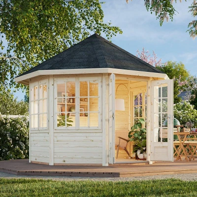 With its stunning design and premium build, the Palmako Veronica 2.9m x 2.9m Octagonal Summer House Log Cabin (28mm) with 4 Windows makes a wonderful garden retreat or hobby room in which to relax and appreciate your garden. Expertly built from superior, interlocking 28mm Nordic spruce logs, this premium log cabin offers you and your possessions exceptional all–round weatherproof protection. Both the 19mm floor and 16mm roof are constructed from tongue and groove cladding, renowned for its robustness, durability and resistance to the elements. The former is supported by pressure treated foundation joists to protect the interior from ground moisture, while the latter's pyramid–shaped design is certain to draw admiring glances from your friends. Please be advised that the roof does not include a covering. You should choose one from the available optional upgrades. Select Charcoal Felt Shingles. (Heavy–duty Charcoal Felt Roof Shingles are a permanent weatherproof roof covering, which is attractive, easy to instal and extremely durable.) The partially–glazed double doors offer you easy access to the interior and are fitted with safety glass, which is always a good idea in a busy garden. These doors also feature a laminated frame, to keep out draughts and prevent the warping and cracking caused by changes in temperature, as well as a stainless–steel sill cover, which prevents the timber wearing down after heavy usage. When you're not at home, a key–operated cylinder lock offers you the reassurance that your valuable items are completely safe from unwanted attention. With its 4 large, opening windows, you'll find this summer house incredibly light and airy, as well as beautifully ventilated on a hot summer's day. This log cabin is delivered untreated. You should apply a quality wood preservative upon assembly and annually, thereafter, in order to maintain the timber's attractive appearance, ensure its weathertightness and validate the guarantee. For a more individual style, why not apply paint instead? This stylish garden cabin is available for you to buy with 2, 4 or 7 windows, and in 2 different sizes. Supplied with a reassuring 5–year guarantee, it includes a full installation kit to help you achieve a straightforward assembly. Free delivery is available to most UK addresses. Built from superior 28mm Nordic spruce interlocking logs 19mm tongue and groove floor 16mm tongue and groove roof Roof cover not included – please select from roof cover options above Partially–glazed double doors fitted with safety glass, a laminated frame and stainless–steel sill Key–operated cylinder lock for added security 4 large, opening windows Reassuring 5–year guarantee Supplied untreated – treat or paint to validate the guarantee Free delivery to most UK addresses