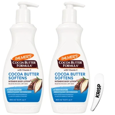 Dual Set for Maximum Value: Includes two 400ml bottles of Palmer's Cocoa Butter Formula with Vitamin E – perfect for both home use and travel. 48-Hour Moisture: Offers intense hydration that lasts up to 48 hours, providing relief for dry, rough skin. Smooths and Tones: Contains cocoa mass polyphenols, known to help smooth skin texture and improve skin tone over time. Dermatologist Recommended: Palmer’s Cocoa Butter Formula is a trusted choice for those seeking high-quality, effective skincare. Cosmetic Spatula Included: Comes with a cosmetic spatula for easy, controlled application.