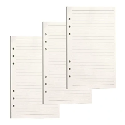 PACKAGE INCLUDES - 3 packs A6 lined paper refill, 45 sheets/pack, total 135 sheets (270 pages), A6 refill paper size is 171 x 94 mm, standard 6 hole paper, hole spacing is 19 mm / 19 mm / 50 mm/ 19mm / 19 mm HIGH QUALITY - A6 planner inserts lined paper is made of thick 100GSM material, smooth and thick surface, thick and soft, ink will not penetrate the paper EYE-SAVING - Our loose-leaf lined paper A6 colour is soft, not dazzling, can better protect your eyes STANDARD 6-HOLE DESIGN - Standard 6-hole design of A6 punched sheetaper, easy to insert or remove paper, suitable for 6-ring A6 folders, fillable planning books, notebooks, diaries, journals, etc WIDELY USED - Refillable ring binder A6 paper refill is suitable for home, school and office. It is also suitable for Filofax personal refills A6, notes, designs, poems, journals, graffiti, drawings, finance, business, writing, sketches, etc