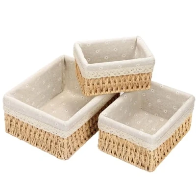 Multifunctional storage: The woven baskets have three practical sizes: Small (18cm x12cmx10cm), Medium (22cm x16cmx11cm), Large(26cm x20cm x12cm), for different storage options. Handmade & Durable: These hamper baskets are handmade by skilled artisans with attention to detail and quality.The baskets are attached with wire and each side is firmly fixed to ensure a long life.The storage baskets come with a removable patterned cloth which makes cleaning very easy. Natural & Recyclable:Made of recyclable paper, No chemical plastics,Eco-friendly and safe tasteless to provide a safe and skin-friendly storage solution, which is important for our nature and environment. Multifunctional:These storage boxes can be used for a variety of purposes, such as storage, organising items, decoration, etc. Examples include storing toys, underwear, towels, cosmetics, cotton buds, tampons, baby nappies, CDs and more. Ideal for use in homes, kitchen,bathroom,offices,vehicles, picnics and other environments for convenience and practicality. Stylish Design:Woven Storage Baskets The simple design and warm colours meet the family's definition of beauty. to suit most modern home decors.This basket also makes a great Christmas gift for friends and family as a home gift