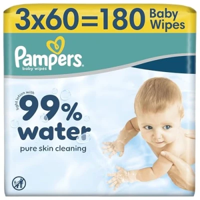 Pampers 99% Water Baby Wipes Plastic Free, 3 Packs of 60 = 180 Wet Wipes, Light Lotion With