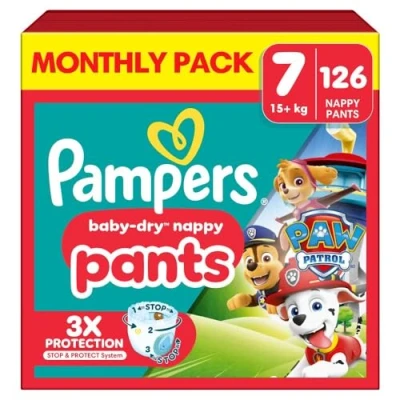 Pampers Baby Dry Nappy Pants Paw Patrol Edition Size 7, 126 Nappies, 15kg+, Monthly Pack, with Our 360 Fit to Help Prevent Leaks