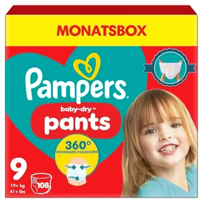 Pampers Baby Dry Nappy Pants Size 9, 108 Nappies, 19kg+, Monthly Pack, 360 Fit to Help Prevent Gaps and Leaks