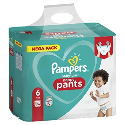 Pampers Baby-Dry Pants diapers for easy changing day. Easy to pull in one motion. Simply pulling out the open sides to tear. Easy way to throw with the adhesive strip. Baby-Dry Pants diapers offer 360 ° fit 's leakage protection against overnight. Flexible waistband around that adapts to your baby's tummy. Super absorbent core that absorbs moisture immediately. Double protective edges that help prevent leakage around the legs.