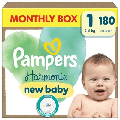 Pampers Harmonie Baby Nappies Size 1, 180 Nappies, 2kg 5kg, Monthly Pack, Gentle Skin Protection Cushiony Soft